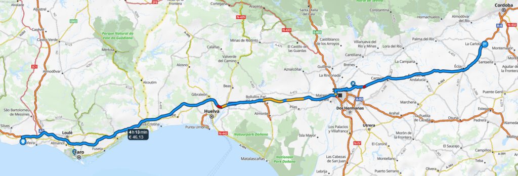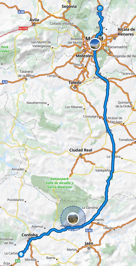 Onderweg weer een stevige wind. We zijn richting Faro over de A22 gereden, bij de grens naar Spanje (de tijd weer een uur vooruit, dus we missen een uur) over een mooie brug gereden, via de A49 zijn we via Sevilla gereden, rond half 6 kwamen we hier aan, we staan nu net voor Cordóba, in La Carlota langs de A4.