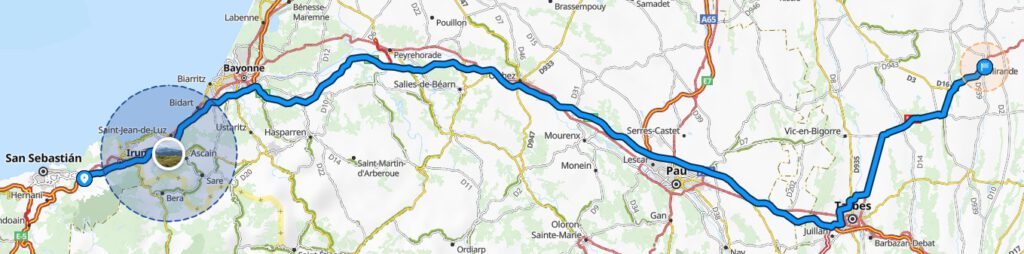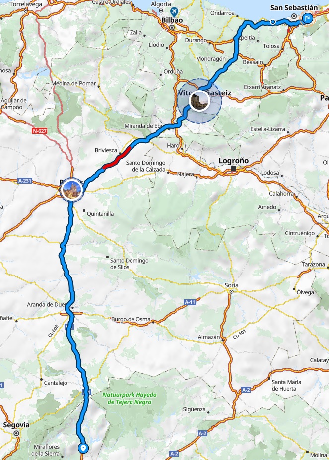 Vandaag zijn we na een ontbijtje lekker gaan rijden vanaf La Cabrera net boven Madrid via Burgos, naar San Sebastian staan we nu in Oiartzun tussen San Sebastian en Irun, en de Franse grens.