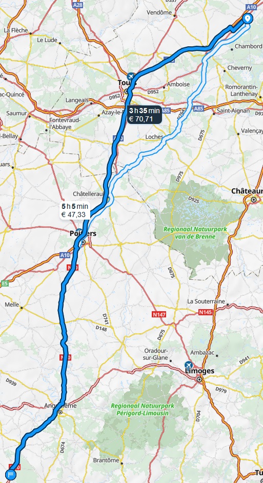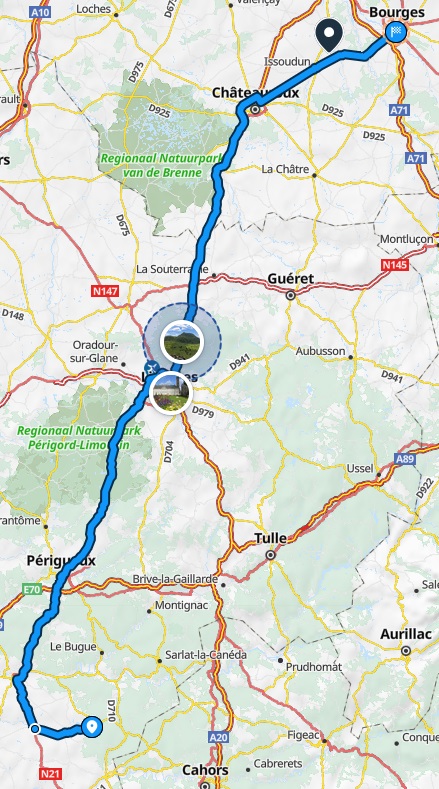 Vandaag zijn we verder gaan rijden vanaf Monpazier in de Dordogne, terug naar de N21 gereden, en hebben deze tot Limoges gereden, rond de middag hebben we boodschappen gedaan in een hele grote supermarkt in Perigieux en daar zitten lunchen, en daarna zijn we doorgereden naar Limoges, en daarna de A20 op richting Châteauroux.