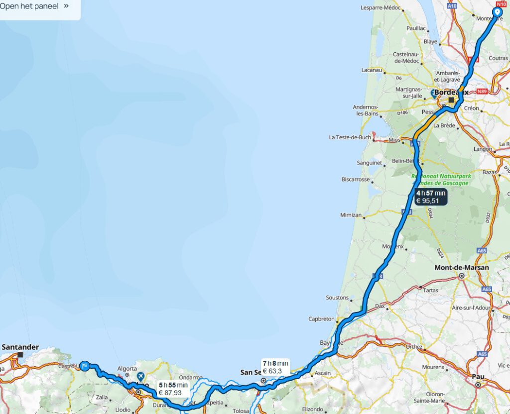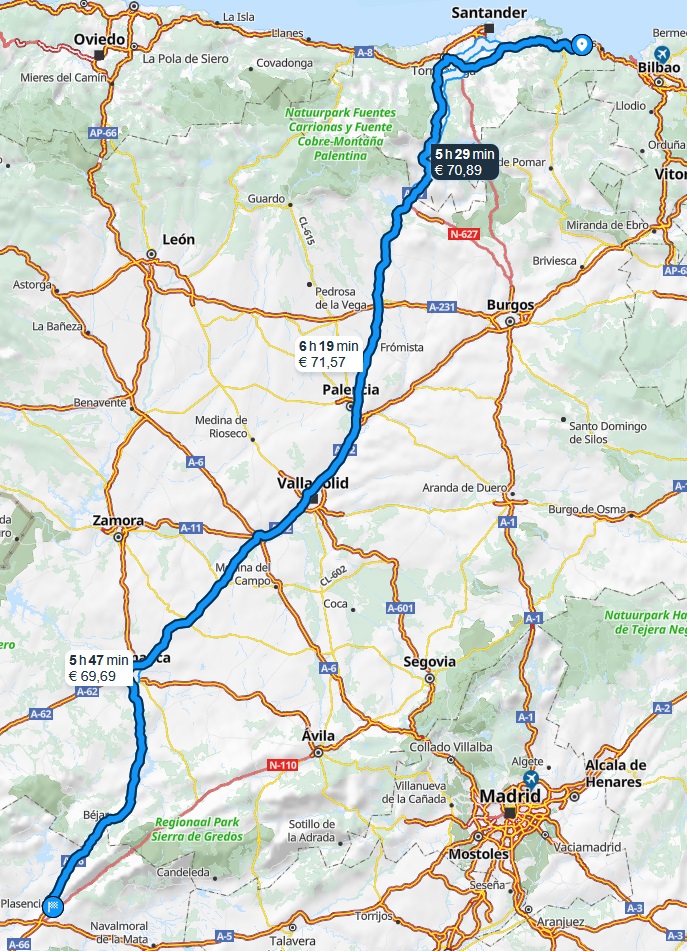 Morgen rijden we via Santander of eigenlijk Torrelavega naar Palencia, Valladolid en Salamanca het binnenland van Spanje in en gaan we de hoogvlakte op.