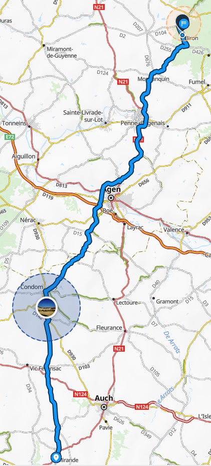 Bij de Mac hebben we besloten om naar een camping te gaan rijden en daarop te gaan mikken. We zijn bij Tarbes de N21 opgereden en die willen we gaan rijden door de Dordogne.