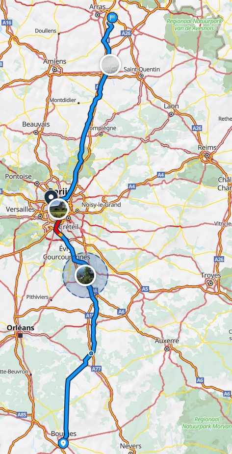 Vandaag zijn we om 9u vertrokken vanaf Bourges en een stuk binnendoor gereden en vanaf Gien, zijn we de A77 opgegaan en later de A6 richting Parijs, 50 kilometer voor Parijs rond 12u zitten lunchen, kwart voor 1 zijn we weer gaan rijden en bij Parijs via de westzijde van de Pheriphérique de A1 op, daar was een ongeval gebeurt en een tijd in de file gestaan, daarna cruisecontrol op 90 en doorboenderen, hoppatee, zou Jens zeggen, maar gas d’r op, en rond 4u waren we op onze camping ‘Arras’, camping La Paille Haute in Boiry-Notre-Dame, hier komen we graag en zeker nu na een prachtige rondreis, om ff een dagje hier te blijven.