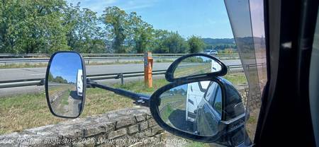 Johnneke trapt daar niet in want ik weet zeker dat alles in orde is aan auto en caravan, en ik houd in m’n spiegels ook achter alles in de gaten. Alleen in de verdachte auto deden gebaren, maar niet inhalend vrachtverkeer of auto’s, als er echt iets aan de hand had geweest waren er meerderen die dat hadden laten weten door te blazen of te toeteren volgens mij. Die verdachte auto stopte even later op de vluchtstrook en heeft even later seinend achter ons gereden en toen kwam die weer naast ons rijden en gillen en gebaren. Bij mij gaan dan alarmbellen af: hier niet intrappen!