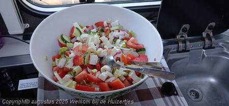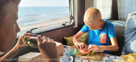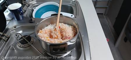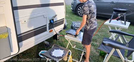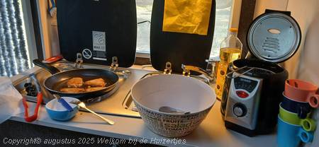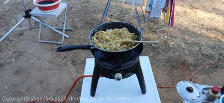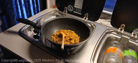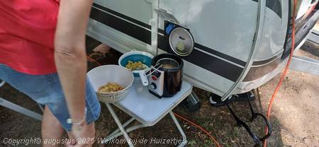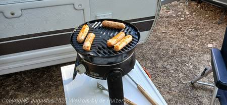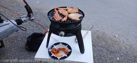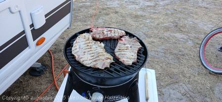Nu lekker aardappeltjes bakken en wat vlees op de Cadac, en lekker in de caravan eten, anders waait ’t eten van je bord op ’t ogenblik.