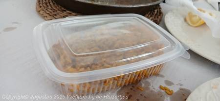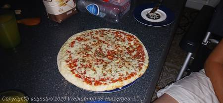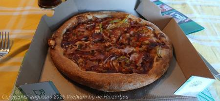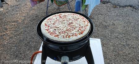 De net gekochte pizza heb ik op de pizzasteen warm gemaakt op de cadac, en het restje paella dat ik mee mocht nemen uit het restaurant opgewarmd en opgegeten.