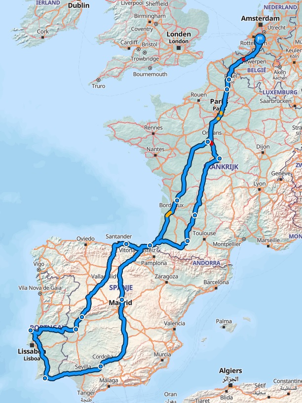 | De route die we gereden hebben van camping naar camping met omwegen: | Thuis (NL), Breda, Antwerpen (B), Gent, Kortrijk, Lille (F), Assevillers (overnachting op aire langs A1), Parijs, Orléans, Beaugency (camping), Tours, Poitiers, N10 naar Angouleme, Chevanceaux (camping), Bordeaux, Bayonne- Biarritz, Irun (E), San Sebastian, Bilbao, Oriñón (camping), Santander, Torrelavega, Valladolid, Salamanca, Plasencia (camping), Cáceres, Marvão (P), Tolosa, Santarém, Caldas de Rainha, Nazaré, Foz de Oralho (camping), Caldas de Rainha, Lisboa, over de 25 aprilbrug, “Costa de Caparica”, Sesimbra, Evora, Algarve, Lagos, Albufeira, Armacão de Pera (camping), Sevilla (E), La Carlota (camping), La Cabrera (camping), Oiartzun (camping), Biarritz (F), Pau Tarbes, Mirande (camping), Auch, Agen, Villeneuve-sur-Lot, Monflanquin, Biron, Monpazier (camping), Villeréal, Castillonnès, Bergerac, Périgueux, Thiviers, Limoges, Châteauroux, Bourges (Camping), Gien, Parijs, Boiry-Notre-Dame (camping), Lille, Calais, Sangatte, Boulogne-sur-Mer, Dunkerque, De Panne (B), Oostende, De Haan, Brugge, Terneuzen (NL), Middelburg, Ouddorp, Vlaardingen, Rotterdam, Gorinchem, thuis.![]() |