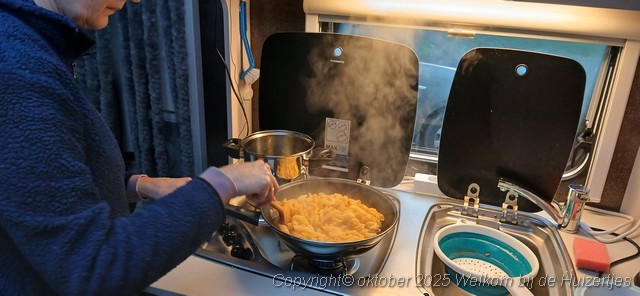 Het heeft afgelopen nacht behoorlijk geregend en het was buiten behoorlijk fris, een graad of 6, maar met de kachel aan was ’t lekker warm in de caravan.